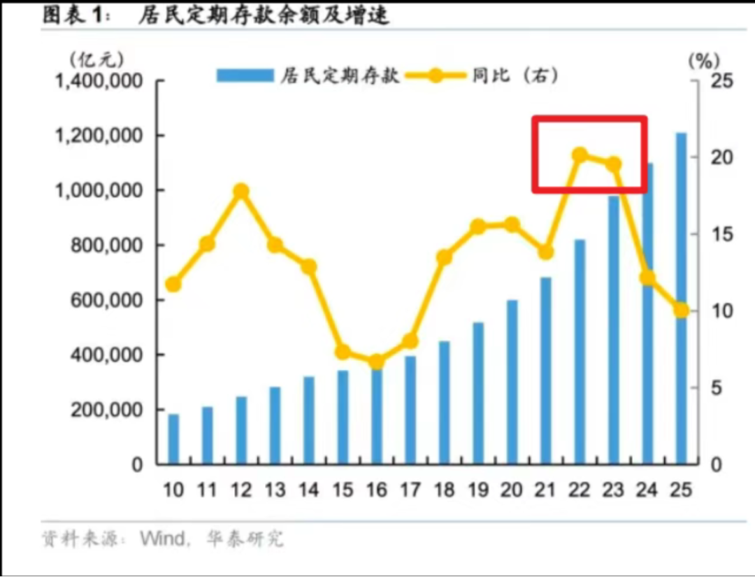 长期存款的到期潮已经成为26年被热议的方向。下图红框部分是居民定存超高速增长的22-23年,也是股市走弱和预期走弱的区间。